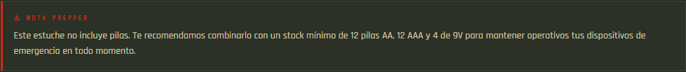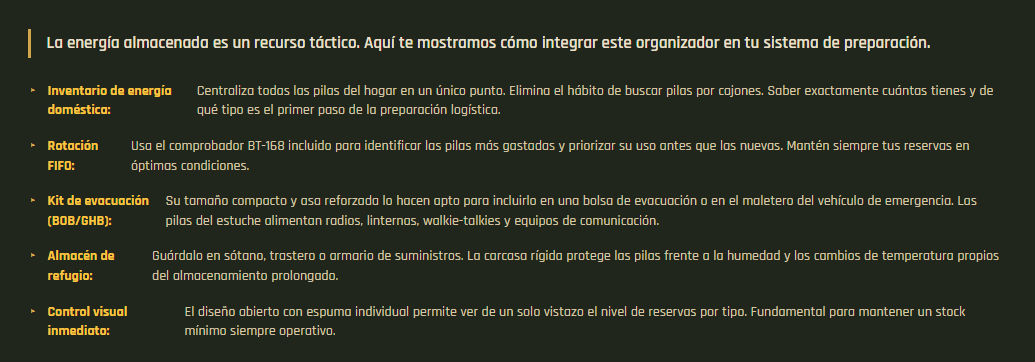 Ya sea para tu hogar, tu refugio o tu kit de evacuación, este organizador es el primer paso para gestionar tu reserva de energía de forma profesional.